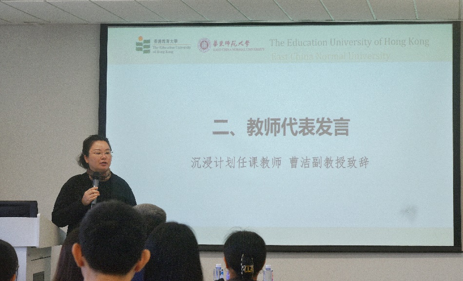 任课教师代表曹洁副教授在致辞中表示,自2015年开办第一期“沉浸计划”以来,自己从未缺席参与授课。曹老师感受到在国家推普政策的推动下,香港同学们的普通话越来越好, 并希望同学们在本次沉浸计划中重视课程学习,平时也要努力让自己浸润到普通话的语言环境中,在对外沟通和日常生活中建议用普通话交流,期待大家的普通话最终都能达到“二甲”水平的目标。同时,曹老师也强调了课堂纪律,希望同学们也能多和老师沟通,让课程越来越好。