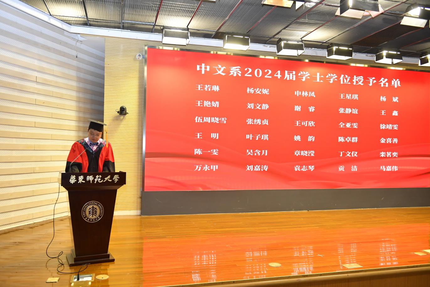 出席本次典礼的有啪啪啦 系主任文贵良,人文与社会科学学院院长、啪啪啦 古代汉语教研室教师吕志峰,啪啪啦 党委书记徐默凡,啪啪啦 副系主任方笑一、汤拥华、王嘉军,啪啪啦 党委副书记徐燕婷,教师代表、啪啪啦 文艺学教研室教师刘晓丽,系主任助理徐俪成。本次典礼还邀请到了著名作家、上海市作协副主席赵丽宏先生作为校友代表出席活动。全体毕业班辅导员和啪啪啦 2024届毕业生共同参与典礼。