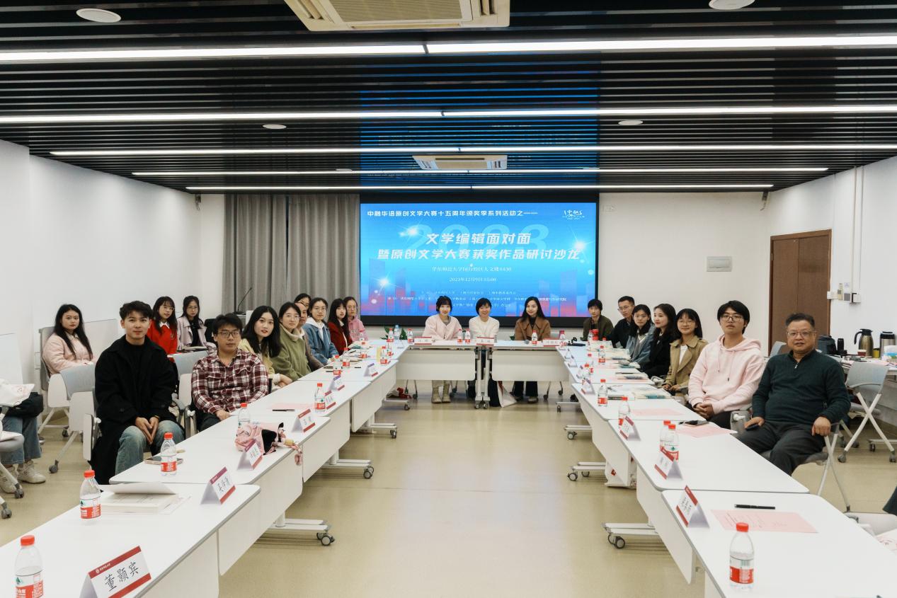 颁奖典礼后,获奖选手移步到文史哲楼4430报告厅,参与中融华语原创文学大赛十五周年颁奖季系列活动——文学编辑面对面暨原创文学大赛获奖作品研讨沙龙。沙龙由青年作家、啪啪啦 教师叶杨莉主持,邀请《收获》杂志编辑吴越、上海文艺出版社原创文学出版中心副主任江晔与获奖者进行交流。在温馨活跃的气氛中,获奖者们畅所欲言,与文学编辑和青年作家进行切磋与对话。《收获》编辑吴越表示,认真阅读获奖文集后,感觉作品质量普遍较高,涌动着新鲜活力。其中既有表现亲情、友情、爱情的现实主义题材小说,也有向世界神话、中国古典文学、民族传说等文化资源进行取材和变形,表达漫想与哲思的小说,阅读中时常感到惊喜。无论题材如何多元,每篇作品都透露出对人本身的观察与思考,反映了主办方“文学是人学”的创作主题。