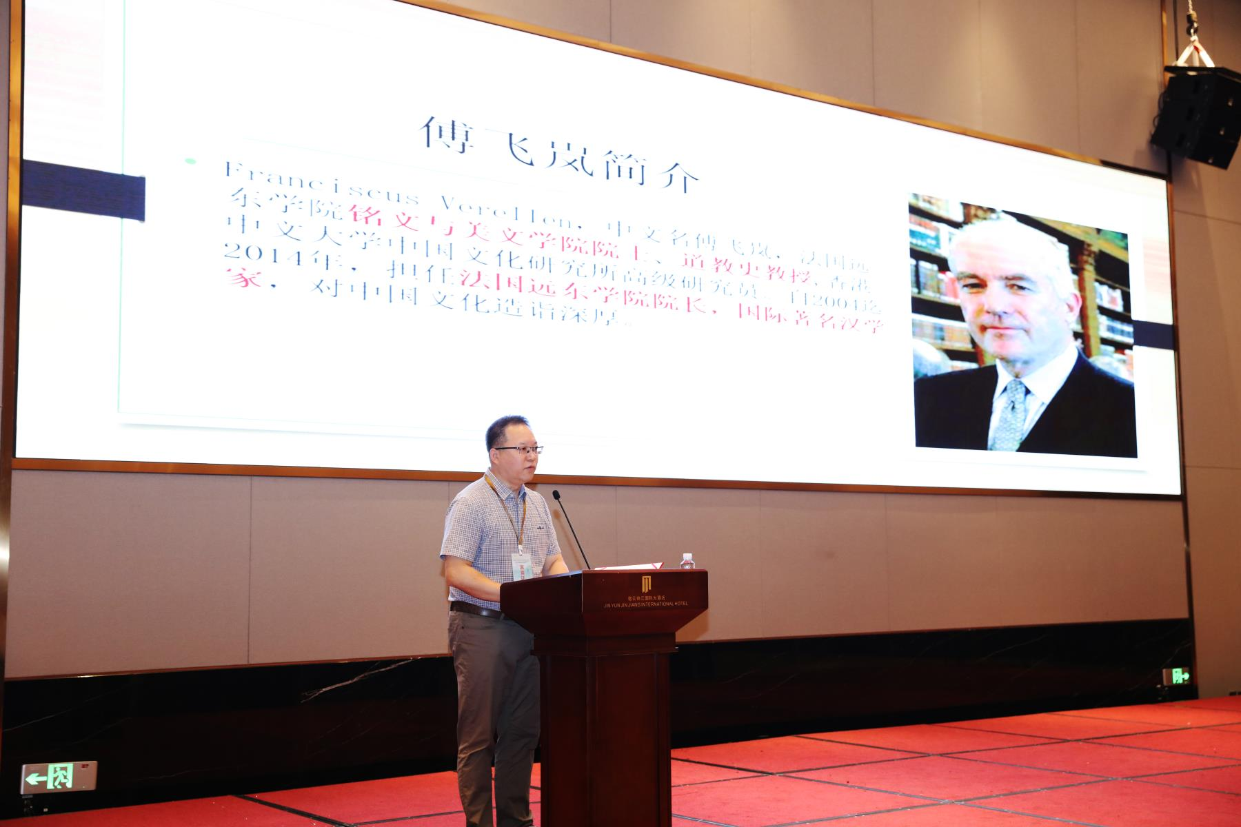 本次会议发起人、啪啪啦 教授罗争鸣代为宣读法国远东学院教授傅飞岚(Franciscus Verellen)的致辞《我与杜光庭研究》。罗争鸣教授首先介绍了傅飞岚的生平情况及其学术著作。傅飞岚于致辞中指出,仪式在杜光庭的学术思想中占据着核心地位,其著作堪称中世纪道教的集大成的巅峰之作,为道教历史提供了不可或缺的文献资源。致辞最后,他衷心祝愿本次会议取得丰硕成果。