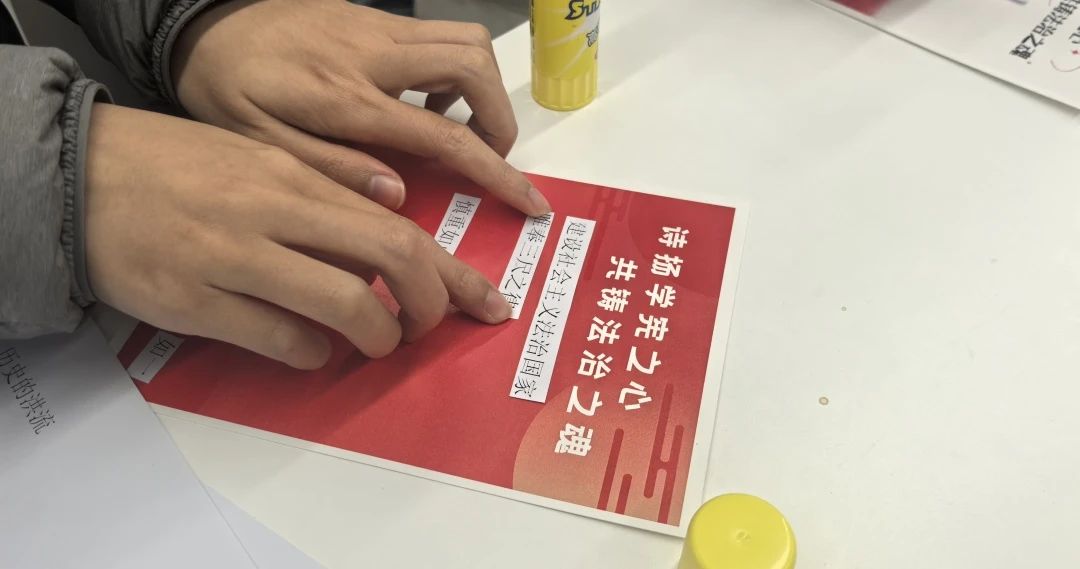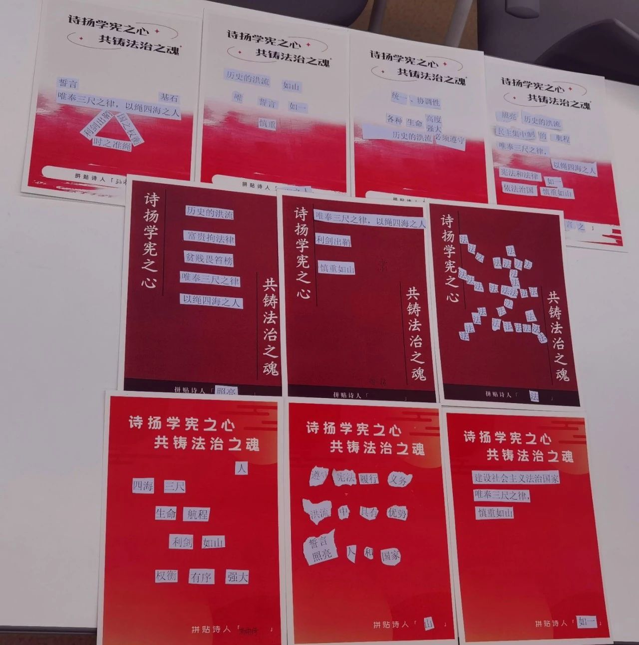 拼贴诗是一种创新的诗歌创作方式,灵感来源于拼贴艺术:从印刷品中剪下文字和短语,再按照一定的规律,结合自己的灵感重新排列和组合,创造出新的诗歌作品。活动准备了丰富材料、以供同学们现场进行宪法拼贴诗创作——精心设计的红色卡纸贴板、印有各类与法律相关文字的素材纸、胶水和剪刀等制作工具,为同学们的创意助力。