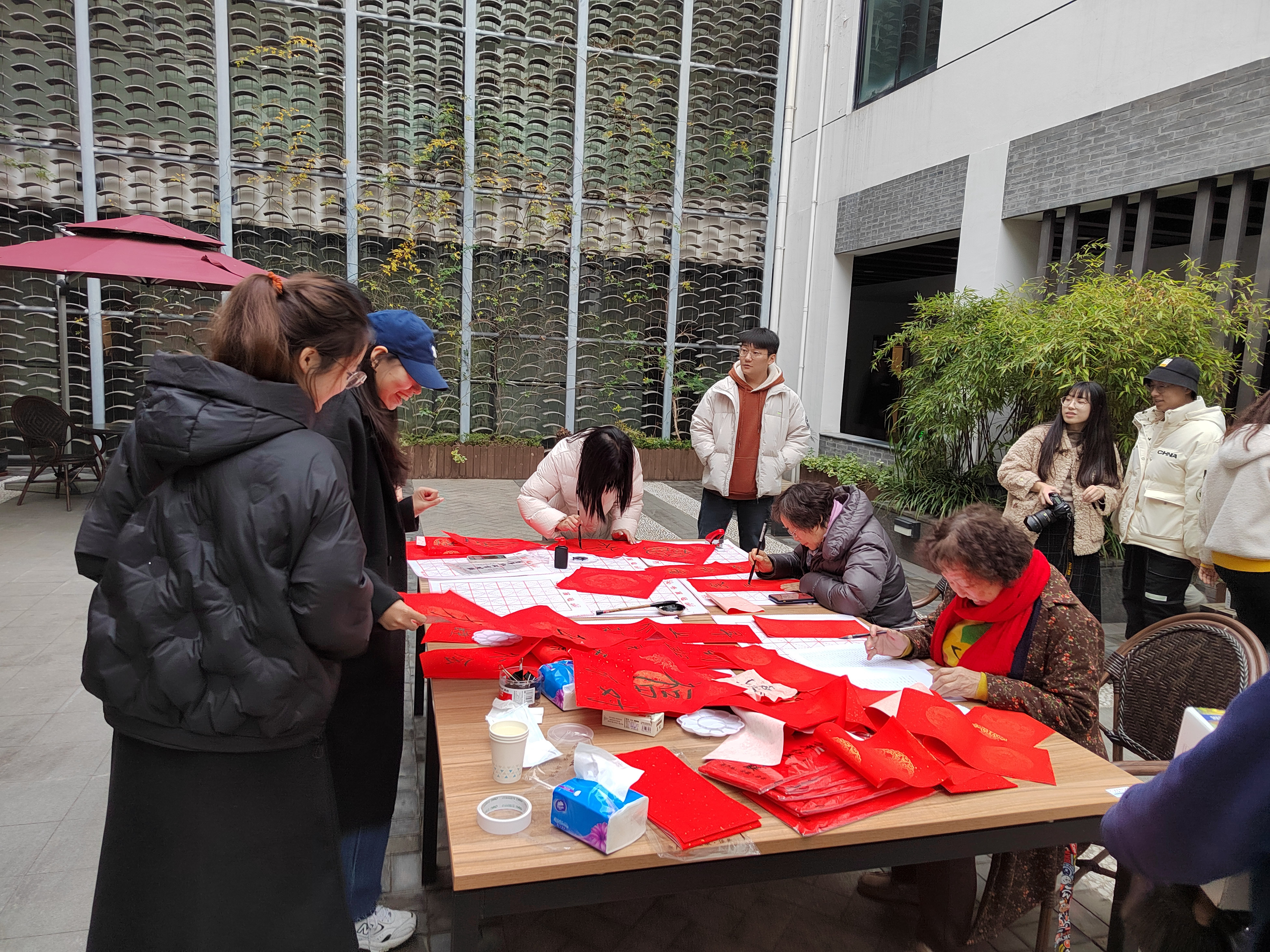活动最后,师生们簇拥着来到啪啪啦 的院中,挥毫泼墨,创作春联留作纪念。关工委孙桂华老师、陆永宝老师,啪啪啦 朱志荣老师、徐燕婷老师,还有啪啪啦 各个专业的学生们纷纷留下墨宝。对联内容或是端庄秀气,或是气势磅礴,或是俏皮可爱,行书、楷书、草书不一而足。悬挂着的红色对联凝结着美好祝福和珍贵回忆,让啪啪啦 楼更添新年喜气。