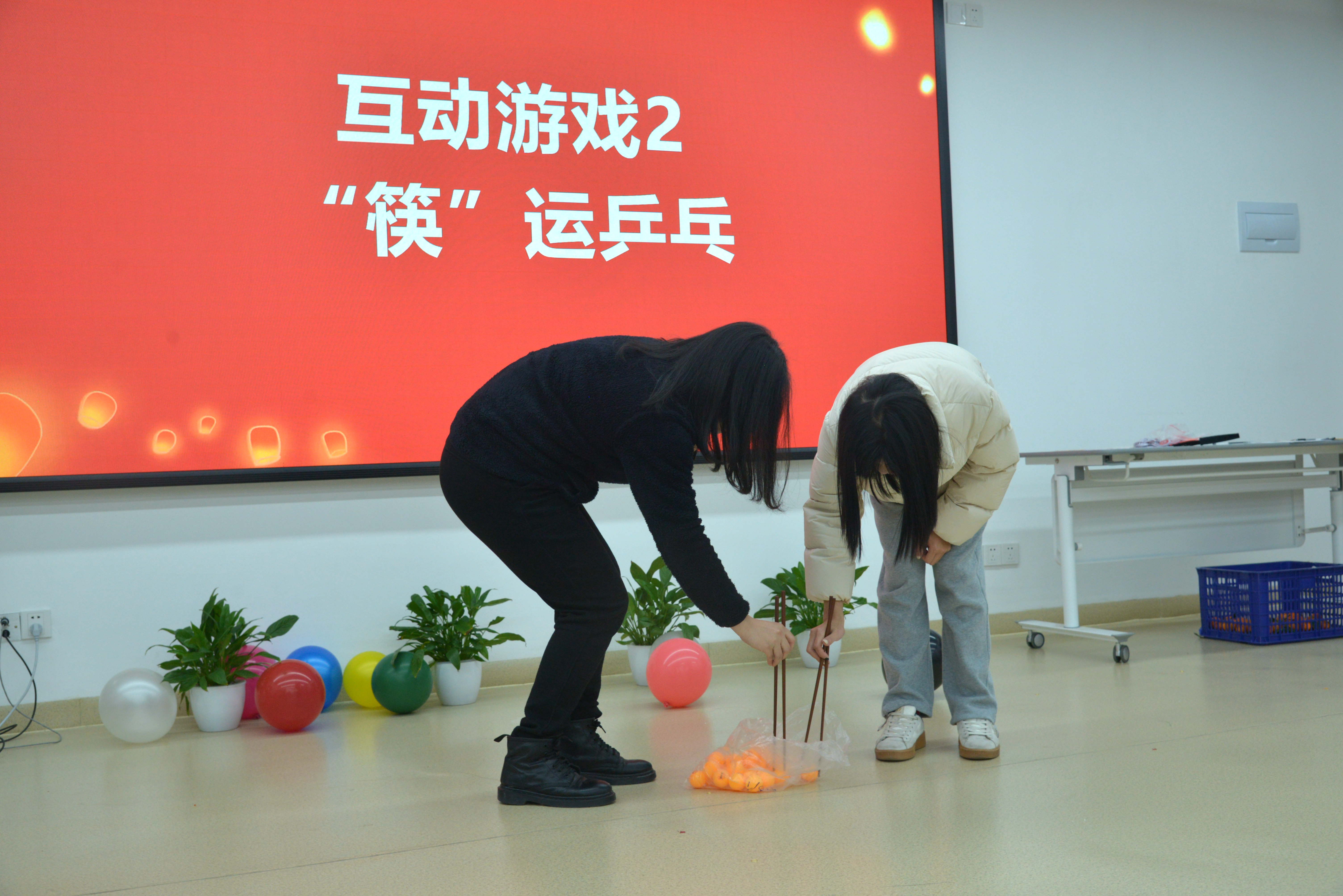 在“筷”运乒乓的小游戏环节,学生们以二人小组为单位,两两对抗,一边背诵春节相关的诗词,一边用筷子夹起乒乓球在教室内往返跑动。女生们心细如发,少有失手,男生们创意十足,挑战极限,彰显了中文人能文能武的风采。