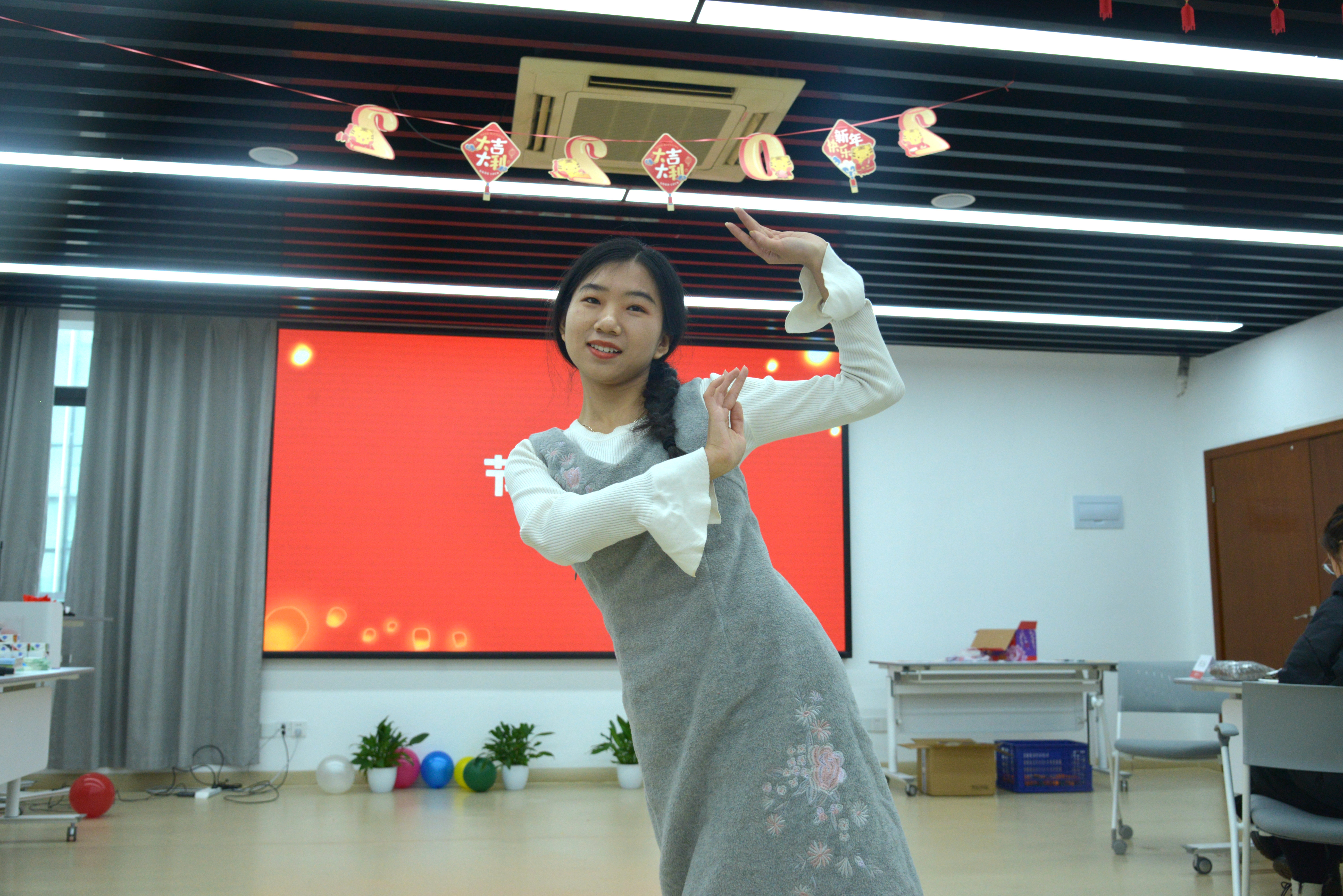 随后,同学们轮番登台,用才艺表演献上自己的新春祝福。张桐珲同学献唱《我们的时光》,正如歌词所写的那样,“我们的时光,是无忧的时光,精彩的年月,不会被什么改写。放纵的笑语,时常回荡在我们耳旁,那些路上的脚印,永远不会被掩藏。”将美好的祝福寄托在歌声中。曹嘉楠同学演唱《红色高跟鞋》,细腻的嗓音和饱满的情感让全场掌声雷动。陈飞同学为大家带来一支古典舞,肢体柔美、步履轻盈,仿佛见到古代的翩翩佳人。秦华侨、吴俊奇、邓倩倩等同学分别带来诗朗诵《一课开花的树》、《去寻找一盏灯》、《城门开》,绵绵诗意驱散了冬日的严寒。