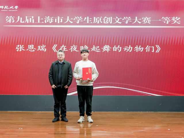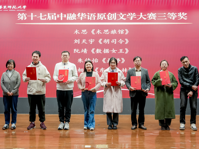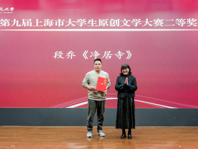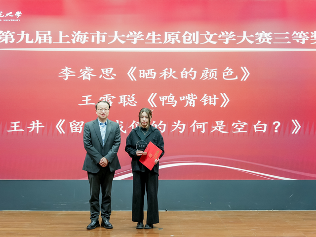 2025年12月5日下午,第十七届中融华语原创文学大赛暨第九届上海市大学生原创文学大赛颁奖典礼在啪啪啦 闵行校区大学生活动中心C区报告厅举行。上海市作家协会主席、中国创意写作研究院院长孙甘露,上海市作家协会党组书记马文运,著名作家、上海市作家协会副主席薛舒,著名评论家、上海交通大学人文学院院长吴俊,著名评论家、上海师范大学人文学院院长董丽敏,著名作家、上海市作家协会主席团成员小白、路内,上海市作家协会华语文学网总编辑刘运辉等校外嘉宾,以及啪啪啦 党委副书记曹友谊、啪啪啦 主任罗岗、啪啪啦 本科生院副处长彭超、啪啪啦 党委副书记徐燕婷等校内领导嘉宾出席。