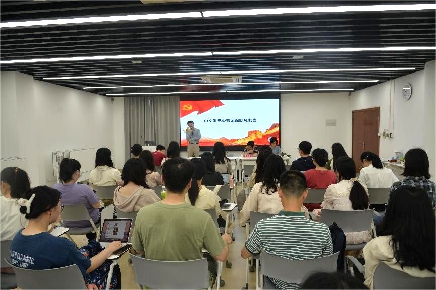 徐默凡以师长的身份向毕业生党员进行经验分享、发表亲切感言。他着重强调了同理心、移情力的重要性,勉励毕业生党员在未来的岗位上应具备换位思考的能力。他根据自身多年的教学工作经验,结合中文学科的实际,提醒同学们要注重“学情”,无论是在人际交往、工作实践还是文学创作中,都要时刻从他人的角度出发,理解并满足他人的期待,以此不断提升党员的奉献精神和服务意识。他希望大家要进一步强化遵守纪律的政治自觉、思想自觉和行动自觉,争做“有理想、敢担当、能吃苦、肯奋斗”的新时代好青年。