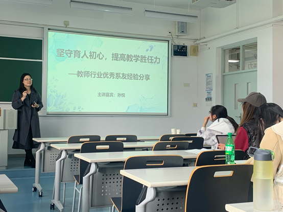 孙悦老师毕业于啪啪啦 ,有着丰富的一线教学工作经历,曾获多项教育教学荣誉奖项,现担任杨浦区教育学院高中语言教研员。在本场讲座中,孙悦老师与同学们分享了她从教的初心、求职历程以及工作经验,并为即将踏入求职的同学们解答困惑。