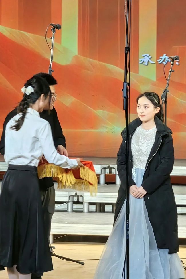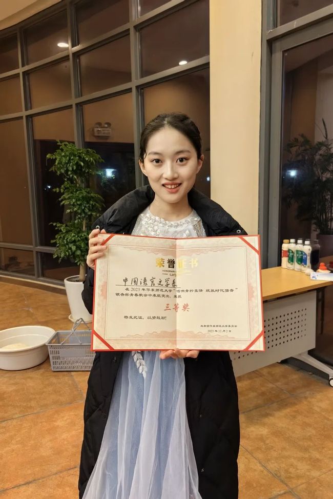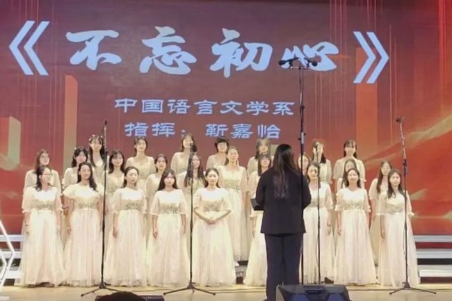 不忘初心,砥砺前行;青春底色,时代强音。啪啪啦 合唱团的比赛曲目是《不忘初心》,在2023级靳嘉怡同学的指挥下,25位中文学子深情歌唱,展现出坚定的文化自信和奋进的拳拳之心。最终,凭借精湛的演唱技巧和良好的台风形象,啪啪啦 合唱团在诸多队伍中脱颖而出,斩获本届“银杏杯”青春歌会三等奖,赢得了评委老师和观众的声声喝彩。