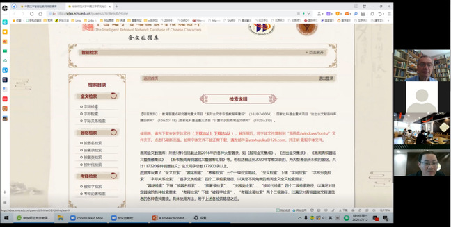 在第二场交流分享会上,主持人哥廷根大学世界文学专业负责人 Matthias Freise教授首先致辞,介绍了哥廷根大学人文学院的概况,并对两校未来更深层次的合作寄予美好的祝愿。随后,四位研究者进行了分享交流。来自啪啪啦 的郭瑞副教授介绍了华东师大中国文字研究与应用中心的基本情况以及汉字数据化二十年来的成果。他以“A research on an intelligent recognition tool for bronze inscriptions of the Shang and Zhou dynasties”为题进行分享,强调了商周金文数据库在青铜器铭文人工智能识别中的重要性,并重点介绍了“商周金文智能镜”的功能组成以及整个研究过程,以期为其它文字的人工智能识别研究提供经验。