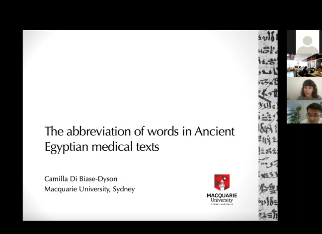 第一场“世界中的古文字”交流分享会由啪啪啦 “明园”晨晖学者顾文艳博士主持,共四位研究者分享了研究成果。来自澳大利亚麦考瑞大学的Camilla Di Biase-Dyson教授以“The abbreviation of words in Ancient Egyptian medical texts”为题介绍了埃及文字医药文献中医生抄写药方时如何简写速记,以便他们书写便捷但仍可以理解。