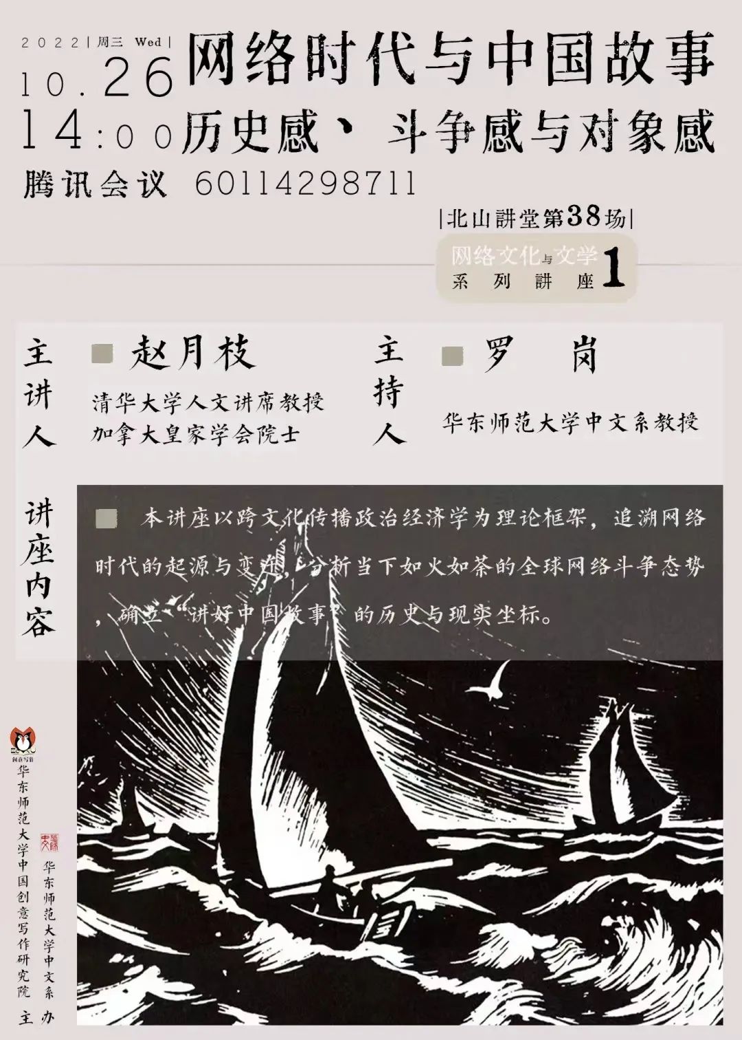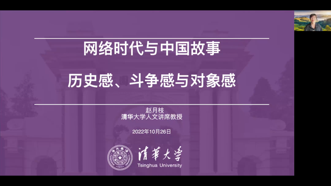 10月26日14:00,清华大学人文讲席教授、加拿大皇家学会院士赵月枝老师以腾讯会议的方式,进行了题为《网络时代与中国故事:历史感、斗争感与对象感》的精彩讲座,由啪啪啦 罗岗教授主持。