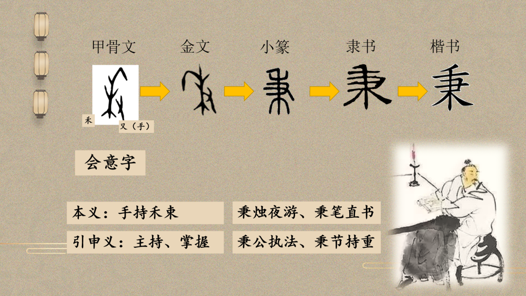 授课团队在教学过程中,多采用追本溯源的教学方法,训练学生的象形思维,注意汉字与汉字之间的贯通联系,揭示汉字的发展历程和文化意蕴。例如在以往的初中汉字教学中,同学们大多只知道“秉”“兼”等字的笔画、楷书写法,并不清楚他们的表义来源,也不会意识到这两个字之间的关联。在古文字与古代生产一课中,授课团队向同学们展示甲骨文和金文字形,“秉”是手持一禾,“兼”是手持两禾,由此可知现在“秉”常使用的主持、掌握之义和“兼”常使用的兼及、一并之义是由本义引申而来,从而加深同学们对汉字理据的理解。