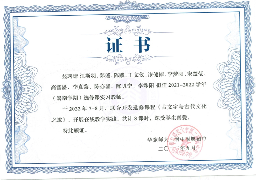 拓展课的开展使我们师范生能够从理想的课堂走进实际的教学,从选题到备课,从试讲到上台,每一步都经历了重重的讨论打磨。一年半的时间里,肖建红老师、汤拥华老师、许可老师都给予了我们热切的指导与关心,强基与师范一起合作、互相支持,将古文字带进了中学课堂。提高自身教学能力的同时,我们更期望构建多元的语文教学,搭建高校与义务教育间的桥梁。而通过古文字这一生动的课题,一方面可以调动学生学习的趣味性,一方面也能够锻炼学生的各项思维能力。希望这个项目能够一届届地传承下去,在我们的基础上越做越好。