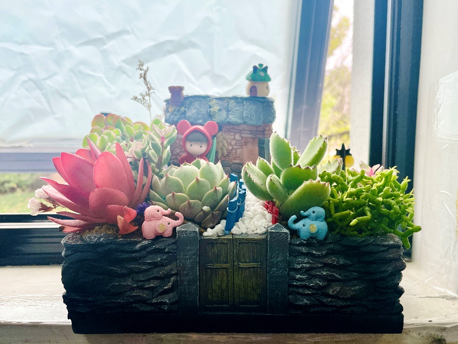 活动开始,彭老师从多肉植物的常见种类、栽培养护知识、造型等方面为大家作了详细介绍,并展示了已经完工的成品。面对桌上琳琅满目的多肉植物,大家摩拳擦掌、迫不及待地动手设计属于自己的多肉景观,将雅乐之舞、吸财树、本巴迪斯、熊童子、稻草人和火炬等多种多肉植物移植到景观盆里,通过自己的创意,加上各式小摆件,使多肉植物景观变得和谐精致。