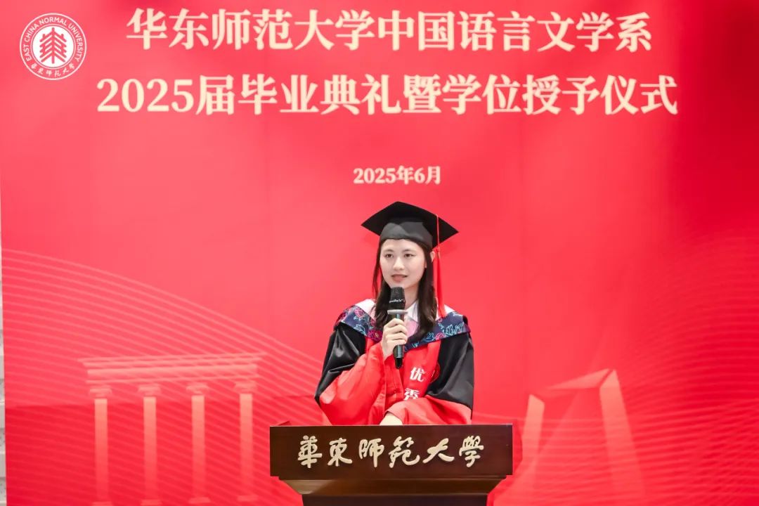 同窗数载霜华共,征鹏万里待扬帆。2025届毕业生即将告别母校、奔赴上海,回首来时路,既有对专业的深情、对同窗的不舍,又有对未来的期待、对理想的坚守。2021级本科生艾佳仪作为本科毕业生代表发言,她谈到,啪啪啦 教会了同学们睁开眼睛看世界,也教会了闭上眼睛聆听内心的声音,相信从啪啪啦 走出的学子们,不会轻易陷入虚无的陷阱,都能找到自己的价值与意义。
