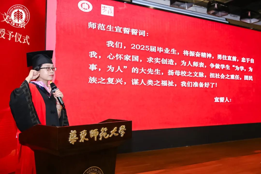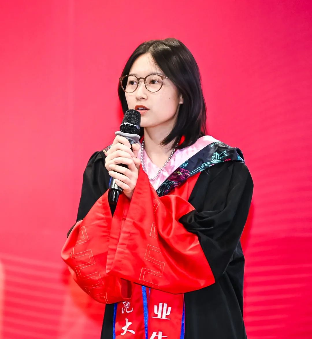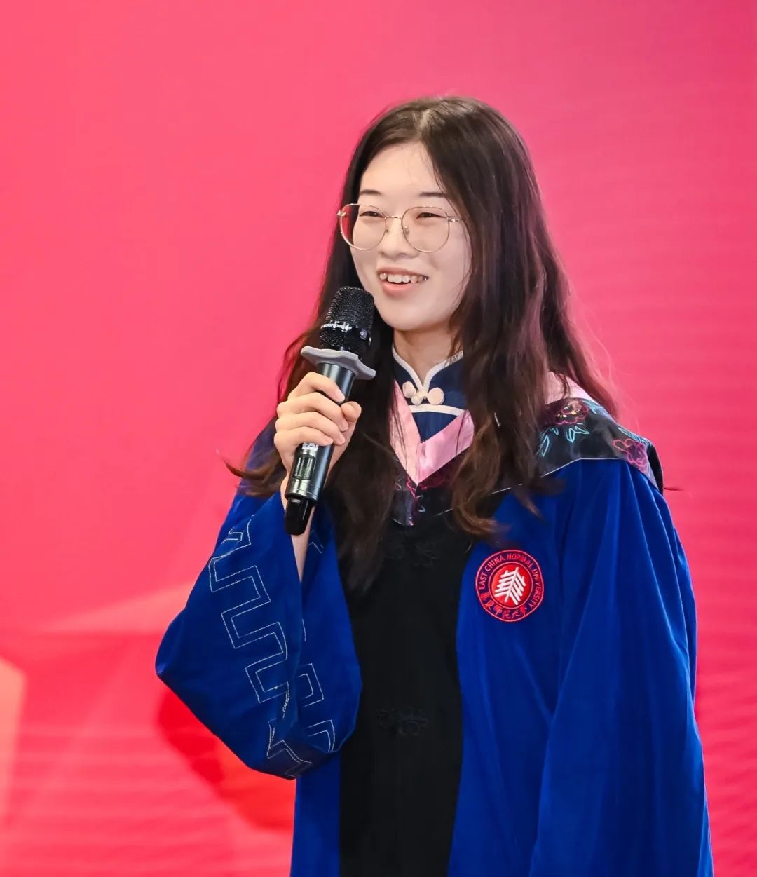 2021级博士生李晓晴作为研究生代表发言,在师大啪啪啦 读研读博的日子里,她领会了思想的艰辛,收获过知识纯粹的快乐,但人与人之间的联结才是长久的源泉。未来他们将带着华东师大的声音,寻求与更多人、更大的世界和鸣。