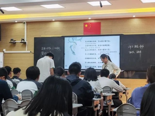 随后,见习的同学们又在三点左右聆听了由梁灿老师讲授的篇目:李贺《李凭箜篌引》。在课上,梁老师以富有诗情的语言将学生们引入了一代诗鬼李贺的世界,深入浅出而又系统地介绍了这位“除了诗,他一无所有”的诗人的人生经历和不幸境遇,并对诗中的关键字句进行了精到的讲解,让学生们深度感受李贺文章之奇绝,潜移默化中提高了分析意象的能力。