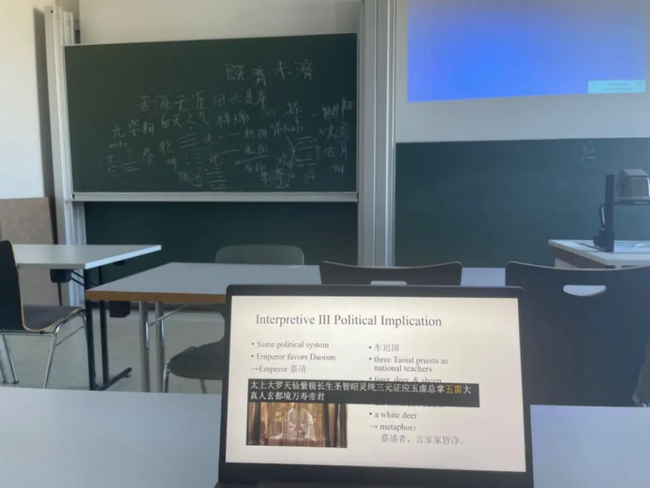 4月,特里尔大学正式开学。我选修了汉学系Soffel教授的两门有关道家文化的课程和语言中心开设的两门德语课程,有时也去旁听为非专业人士开设的经济学通识课。Soffel教授学识广博,平易近人,予我帮助良多。在汉学系的课程中,我不仅了解到域外汉学学者对于道教文化的理解和研究重心,更有机会通过另一种语言带来的陌生化效果,重审那些我原本习以为常的古籍文本。此外,我也有幸在Soffel教授的邀请下自主设计主题讲座,向德国学生介绍我喜爱的古代诗词及中国传统文化。此外,特里尔大学常常举办各种汉学学术会议,我聆听了来自不同国家和地区的学者们的精彩发言,也结识了许多欧洲青年学者。他们来自不同的文化背景,拥有不同成长经历,又出于对中华文化的共同热爱而走到一起。