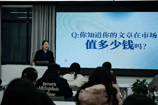 接着,姜晓玉就“作为创作者应该考虑哪些问题”和“作为市场买单用户存在哪些误区”两个议题与同学们展开了交流。针对 “商稿写作中,文学性和商业性是否存在对立面”、“没有深度观点输出的文章是否具有存在的必要性”以及“AI写作是否会让写手失业”等现实问题,姜晓玉用亲身实践的具体案例给出了自己的答案:一篇好商稿的最大亮点往往是它与文学的结合,优秀的写手所长期追求的,正是市场与文学的平衡,这也是AI写作难以达到的高度。
