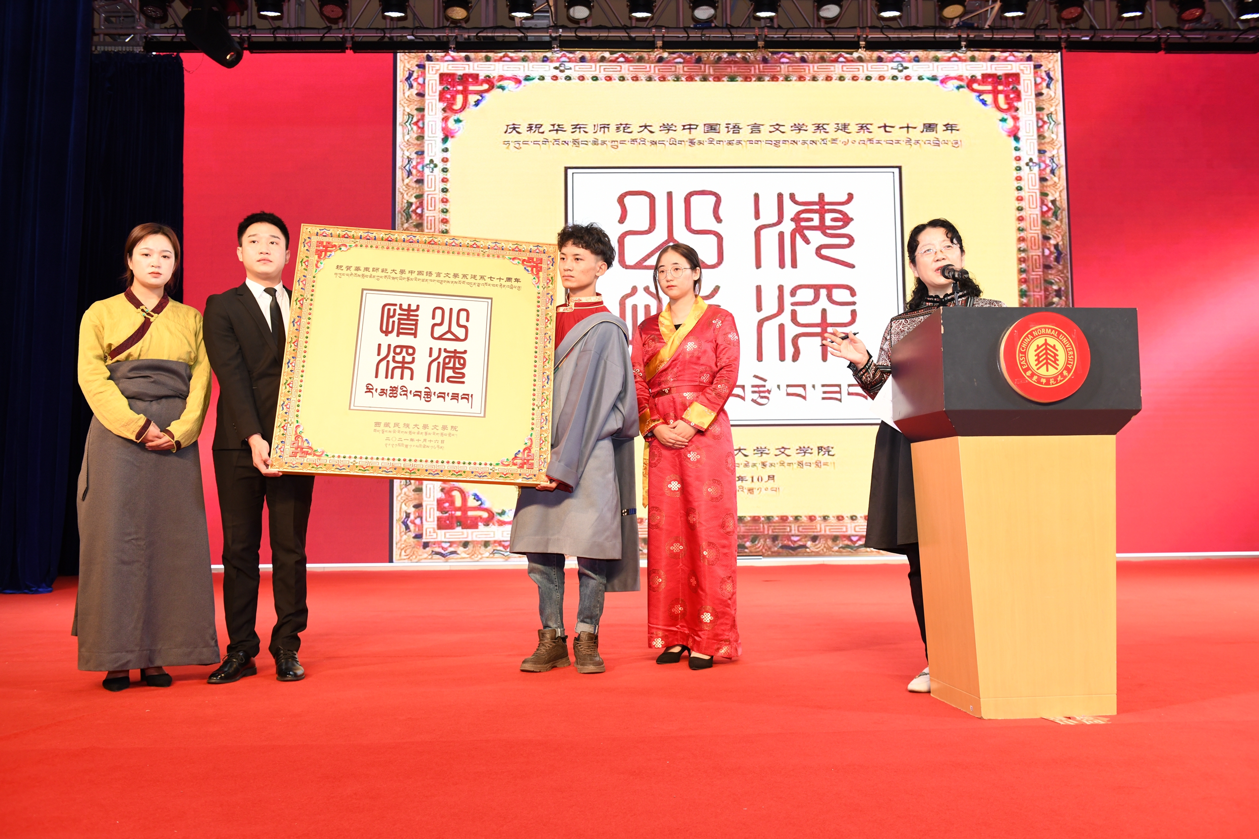 一直以来,华东师大啪啪啦 坚守社会使命,以服务国家和区域经济社会发展为目标。作为对口支援学校代表的西藏民族大学文学院党委书记任秀丽在大会上致辞,她表示,自六十年代,在华东师大建校不到十年,啪啪啦 建系不到十年的时候,30余名毕业生支援西藏公学,即西藏民族大学的前身,来自啪啪啦 等院系的毕业生们为民族教育事业勤奋耕耘,架起了友谊之桥,一直到今天,华东师大啪啪啦 与西藏民族大学文学院继续共谱办学新篇章。大会现场,西藏民族大学的同学们还送上了西藏民族大学文学院的贺礼,由藏汉文字书写的“山海情深”。任秀丽书记介绍,字的边框为西藏人民创作的“长城文”,寓意以长城筑牢中华民族共同体意识。