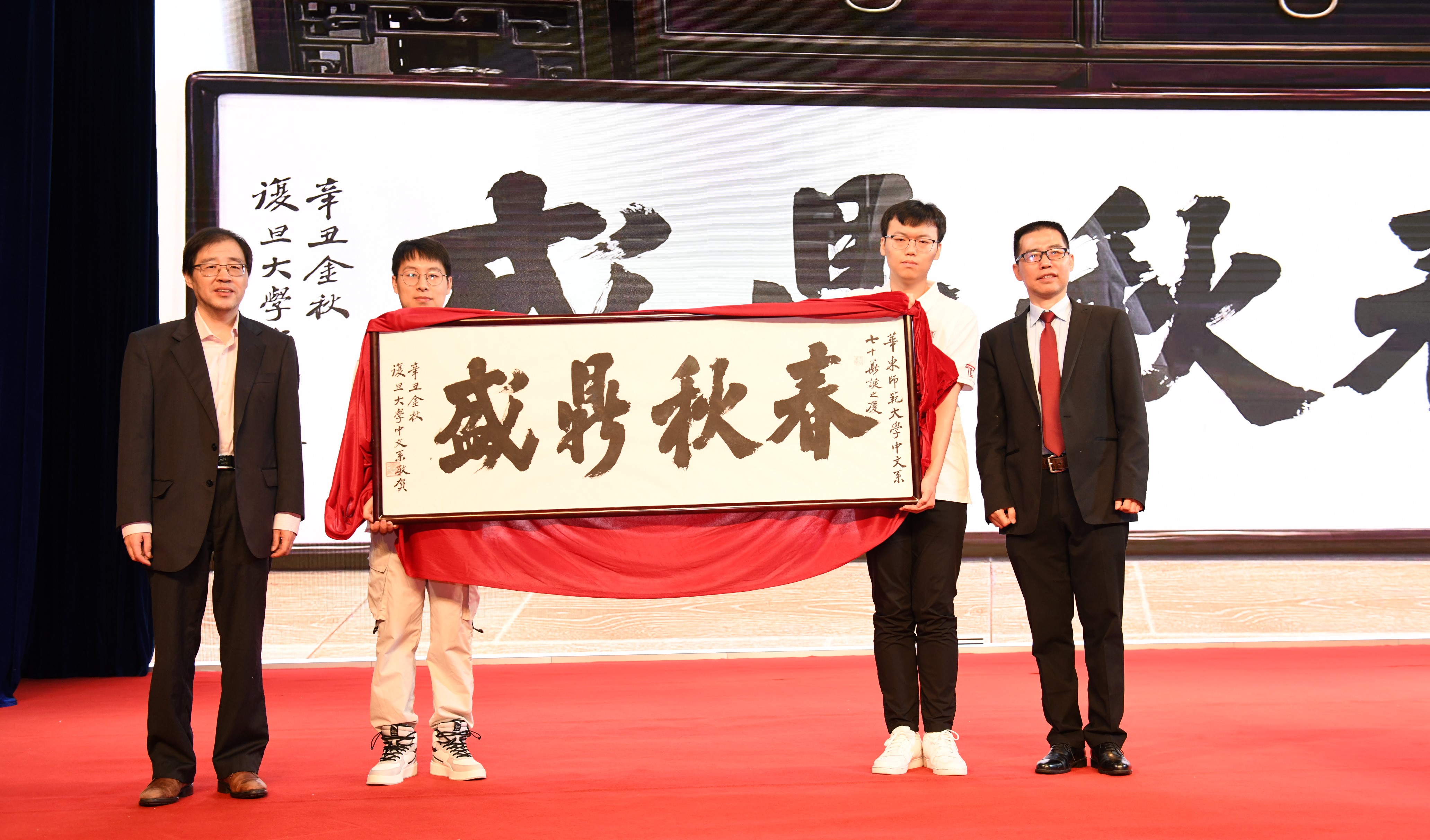 为表达情谊,复旦大学啪啪啦 准备了一幅题为“春秋鼎盛”的墨宝,在大会现场由朱刚教授赠予华东师大啪啪啦 。