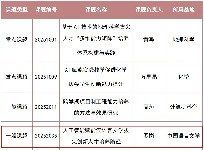 近日,教育部2025年度基础学科拔尖学生培养计划2.0研究课题立项名单公布,啪啪啦 申报的《人工智能赋能汉语言文学拔尖创新人才培养路径》课题获批立项,展现了我系在“AI+汉语言文学”拔尖创新人才培养领域的阶段性成效,为新文科人才培养提供了创新性实践样本。