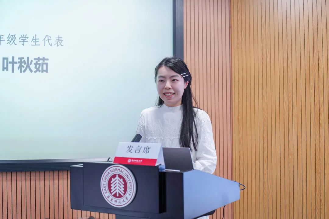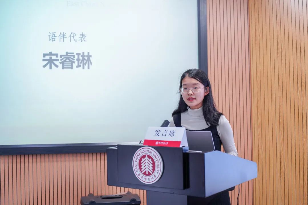 语伴宋睿琳作为学员和语伴代表分别进行了发言。叶秋茹同学表示,对于香港教育大学同学而言,语言的转变是一项巨大挑战,但在华东师大这一温暖的地方,有良师益友相伴,相信会度过一段回首珍贵的时光。孙远威同学表示,香港与内地虽然教学方式存在差异,但教学目的却相通,均以传播中华优秀传统文化为理念,同时差异才是交流学习的宝贵财富,希望在未来的时间学有所获。宋睿琳同学表示,从普通话正音到文化交流,从课内理论学习到课外延伸训练,语伴助教团队将严格要求自己,耐心热情地为各位同学答疑解惑,与香港同学共同体悟汉语语言之美、中华文化之深。开班典礼的最后,为在座的领导和老师展示了2023年度沉浸计划的初阶成果,分别是由香港教育大学同学制作的2023年沉浸课程一周回顾视频,以及由香港教育大学同学和华东师大语伴合作的普通话朗诵古诗《春江花月夜》。至此,香港教育大学中国语文教育荣誉学士(五年全日制)课程内地沉浸计划开班典礼顺利结束。在未来八周,啪啪啦