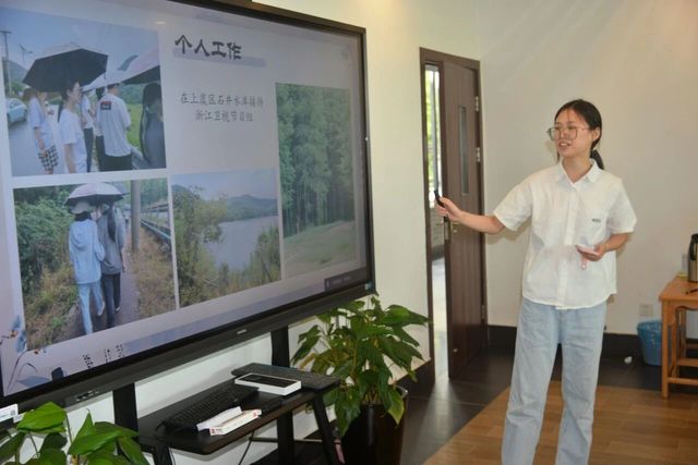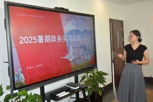 学生骨干培养计划成员代表陈倩、蔡蓥奥、杨雨绮、宋楚莹、朱雪华、巩成林、王欣雨、高畅、徐彧、许楚宜同学汇报暑期社会实践成果。他们奔赴祖国各地,在政务实践、支教推普、红色研学、志愿服务中挥洒汗水,展现啪啪啦