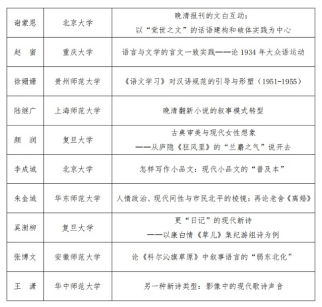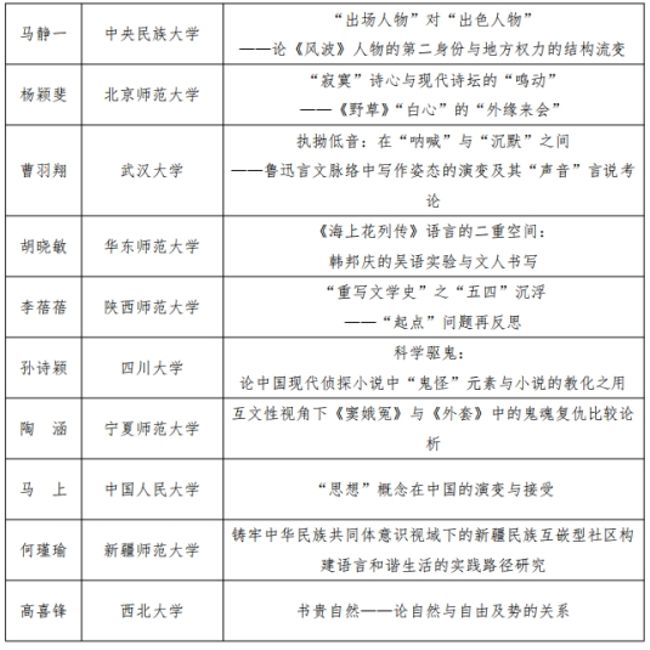 闭幕式于人文楼4430教室举行,啪啪啦 中国现当代文学专业博士生张炎担任主持。张炎对与会嘉宾的恳切指点与同学们的积极参与表示了感谢。接着给冯凰、胡晓敏、李晓、李成城、马上、牛原、孙浩、王潇、王晨雪、王玥琳、谢蒙恩、颜润等获得“优秀论文奖”的十二位同学颁发获奖证书。北京大学谢蒙恩同学、宁夏师范大学孙浩同学发表获奖感言,他们分享了自己学术研究的经验,并对会议主办方表示了感谢。